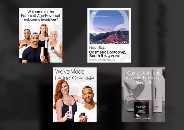 twentyfour skincare is a modern skincare brand focused on reversing the signs of aging through a revolutionary formula and delivery method. They partnered with RCMA to build their identity from the ground up. This section highlights a selection of the ads my team and I created, along with supporting social content and additional materials.